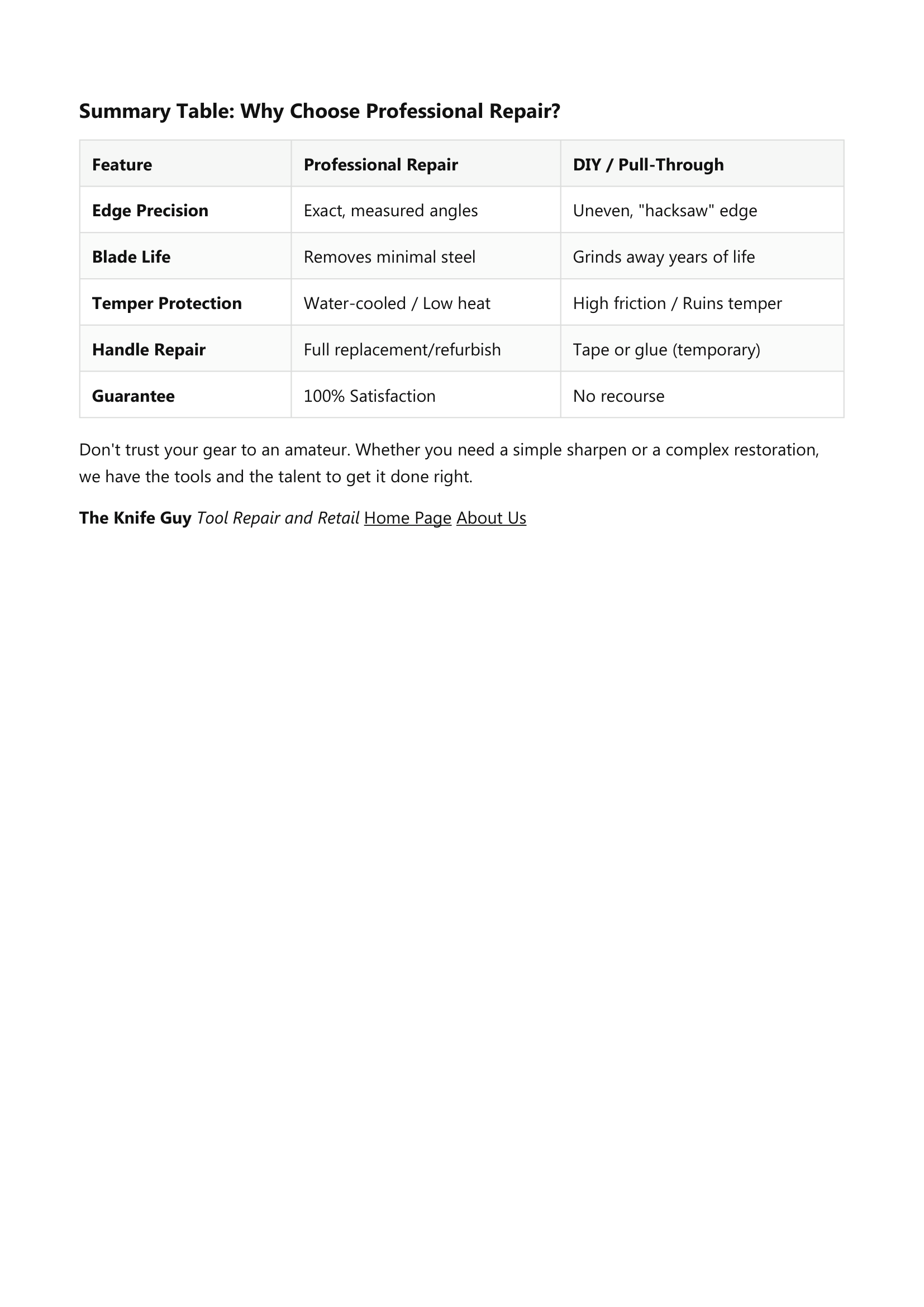 Evaluate your current inventory. Look at your kitchen drawer. Inspect your tool shed. Professional knife restoration services offer a second life for tired blades.